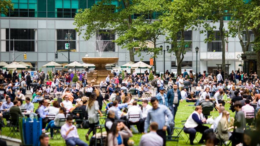 Bryant Park’s lawn is planted with a rye/fescue/bluegrass mix. The lawn is as long as a football field (300 feet) and 215 feet wide. It is occasionally closed for aeration, fertilization, or protection during wet weather. We hold many free, large-scale events on the lawn, like Yoga and Movie Nights, so it often needs rest before and after big events.
